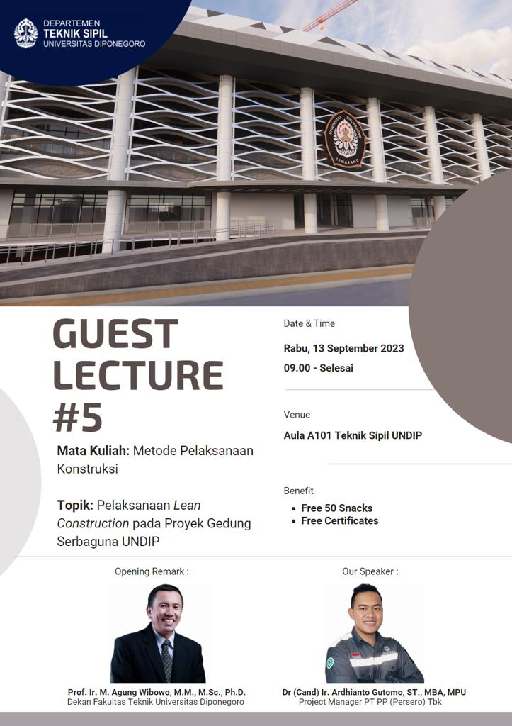 sipilsandbox.undip.ac.id – Pada Rabu, 13 September 2023, akan dilaksanakan kuliah umum tentang Metode Pelaksanaan Konstruksi dengan topik Pelaksanaan Lean Construction pada Proyek Gedung Serbaguna UNDIP. Berikut adalah informasi lebih lengkapnya.