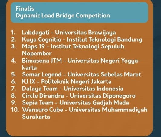 Rangkaian kegiatan selanjutnya adalah Dynamic Load Bridge Competition (DLBC) yang membawa tema “Modern and Futuristic Bridge to Support Sustainable Construction” pada ajang ini Teknik Sipil UNDIP juga berhasil mengirimkan satu perwakilannya di babak final. Tim tersebut adalah Circle Dirandra yang beranggotakan : Ganes Febri Sesario (21010118130104), Alvinata Winarno (21010118120049), dan Dimas Imam Dermawan (21010118130096). Babak penyisihan berupa seleksi Proposal dan Video Pemodelan Jembatan diadakan mulai tanggal 22 September 2020 dan berakhir pada 9 Oktober 2020. Lalu babak final dilaksanakan pada 31 Oktober 2020 yang terdiri dari tahap Voting Video Perakitan Jembatan dan tahap Presentasi. Pada ajang ini Teknik Sipil UNDIP belum berhasil membawa pulang juara.