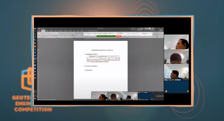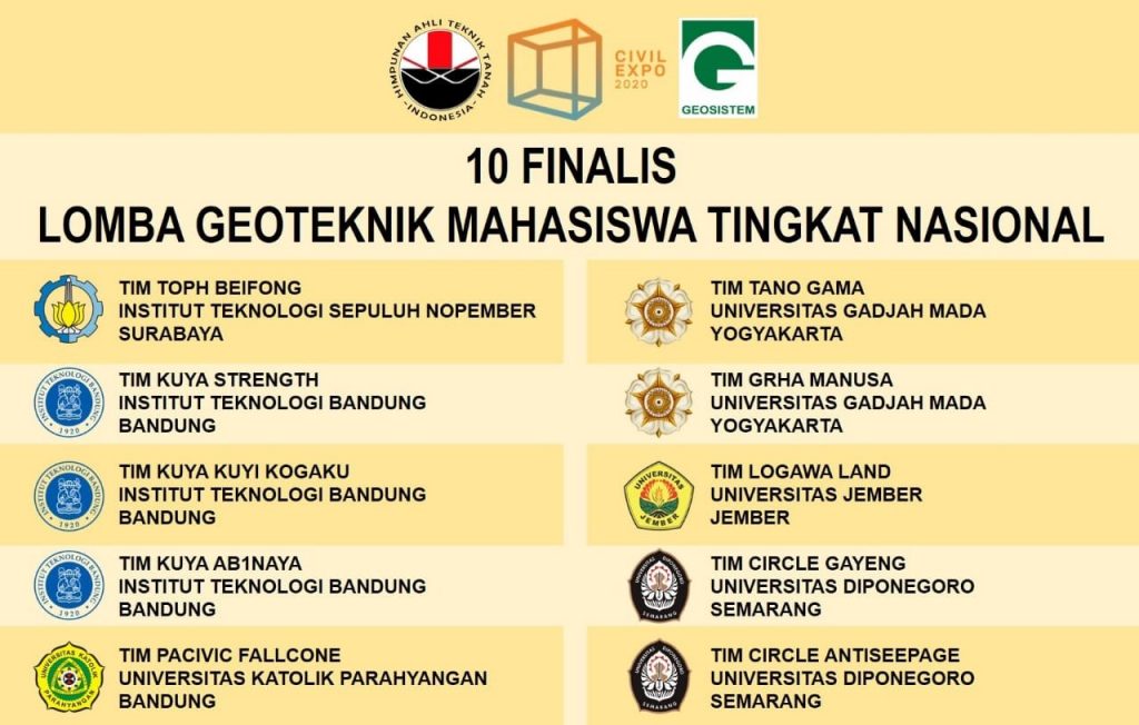 Perlombaan bertajuk Geotechnical Engineering Competition (GEC) bekerja sama dengan PT Teknindo Geosistem Unggul dan Himpunan Ahli Teknik Tanah Indonesia (HATTI), GEC tahun 2020 mengusung tema “Design for Sustainable Soil Improvement” diikuti oleh Total 69 Tim yang berasal dari 28 Perguruan Tinggi di Indonesia. Babak penyisihan berupa seleksi Proposal diadakan dari 1 – 18 Oktober 2020 dan menyisakan 10 tim yang dinyatakan berhak melaju ke babak final. Pada ajang Geotechnical Engineering Competition (GEC) Teknik Sipil UNDIP berhasil mengirimkan 2 wakilnya ke babak final yakni tim pertama adalah Tim Circle Gayeng yang beranggotakan : Muhammad Sigit Wahyudi (21010117120044), Paulus Kevin (21010118140178), dan Thomas Marcellino Santoso (21010117120024). Lalu tim kedua adalah Tim Circle Antiseepage yang beranggotakan : Adho Triananta Saputra (21010118130208), Bayu Prasetyo Adjie (21010118140147), dan Panca Edi Kurniawan (21010118140156). Babak final berupa Pemaparan Study Case dan Presentasi yang diadakan pada tanggal 29 dan 31 Oktober 2020. Namun tim dari Teknik Sipil UNDIP belum berhasil menyabet juara ada ajang perlombaan ini.