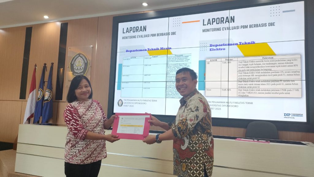 sipilsandbox.undip.ac.id – Pada tanggal 10 Maret 2023, Departemen Teknik Sipil mendapat kesempatan untuk melakukan paparan progres OBE dalam kegiatan Monitoring dan Evaluasi Proses Belajar Mengajar Berbasis OBE. Departemen diwakili oleh Ketua GPM, Dr. Yulita Arni Priastiwi, S.T., M.T. dan Sekretaris GPM sekaligus Sekretaris Prodi S1, Dr. Ir. Hari Nugroho, M.T. Kegiatan berjalan lancar dengan hasil pihak TPMF memberikan masukan dan penilaian terhadap progres pelaksanaan OBE di prodi S1, S2, dan S3 Teknik Sipil.