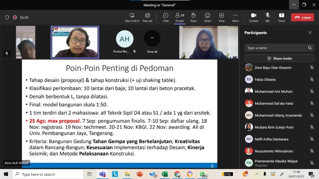 sipilsandbox.undip.ac.id – Beberapa tim yang terdiri dari mahasiswa dan dosen pembimbing tercatat akan mengikuti perlombaan KJI dan KBGI 2023. Serangkaian persiapan dilakukan untuk dapat memberikan hasil terbaik dari dua perlombaan tersebut. Mulai dari koordinasi awal, sharing ilmu dengan pemenang tahun 2022 dari Polines dan UNJ, mengikuti sosialisasi yang diselenggarakan oleh puspresnas, hingga pelatihan software yang menunjang desain jembatan dan gedung.