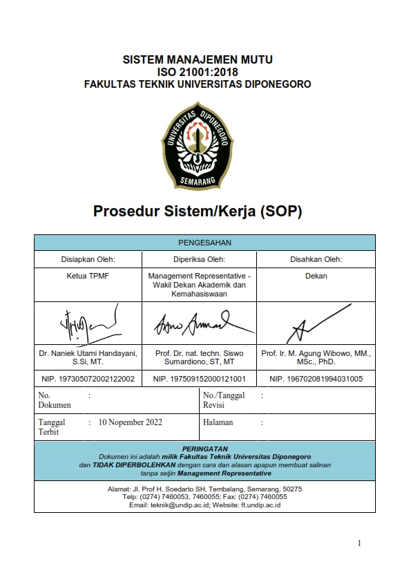 Dokumen SOP yang berlaku di seluruh lingkup Fakultas Teknik UNDIP dapat diunduh pada link berikut.