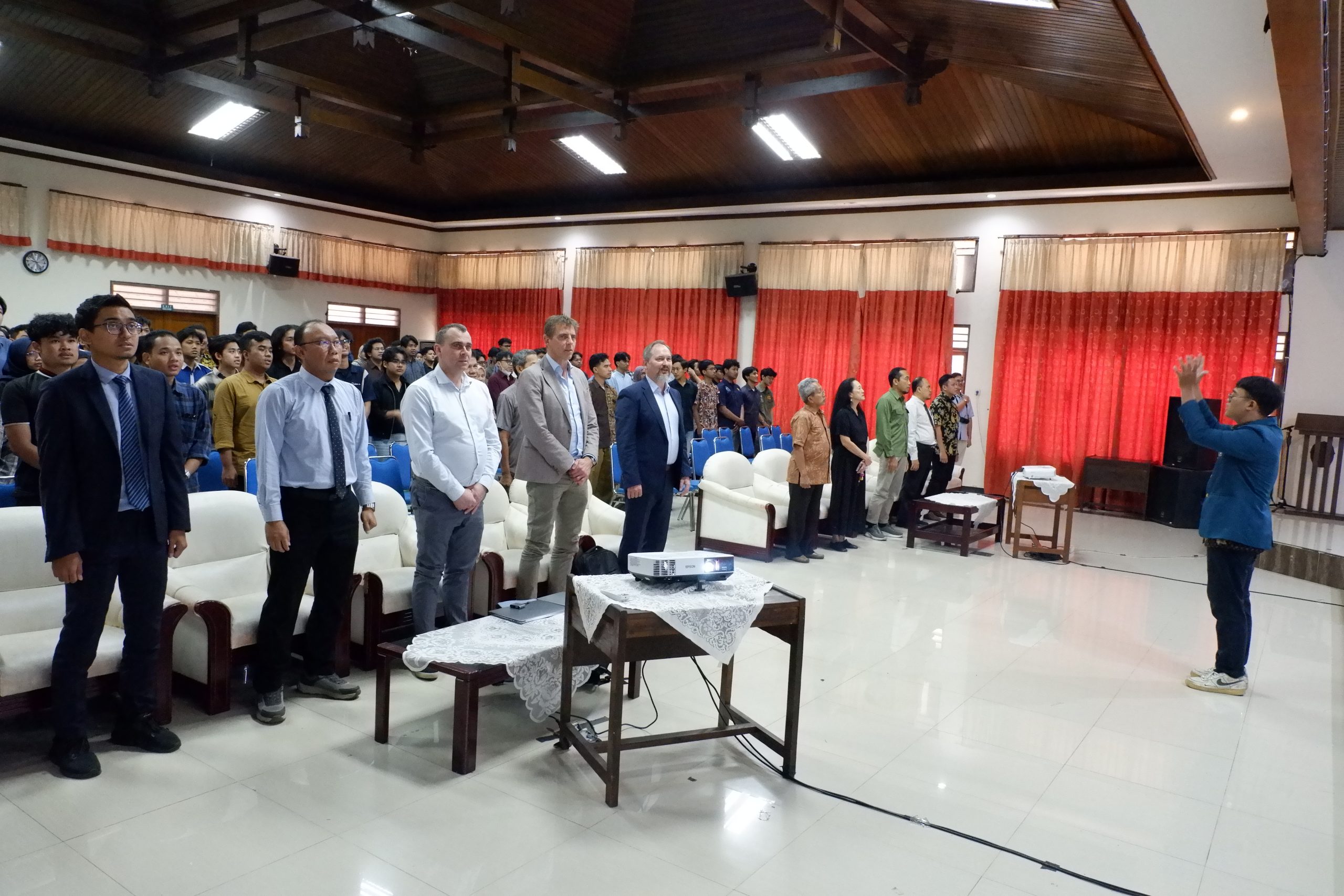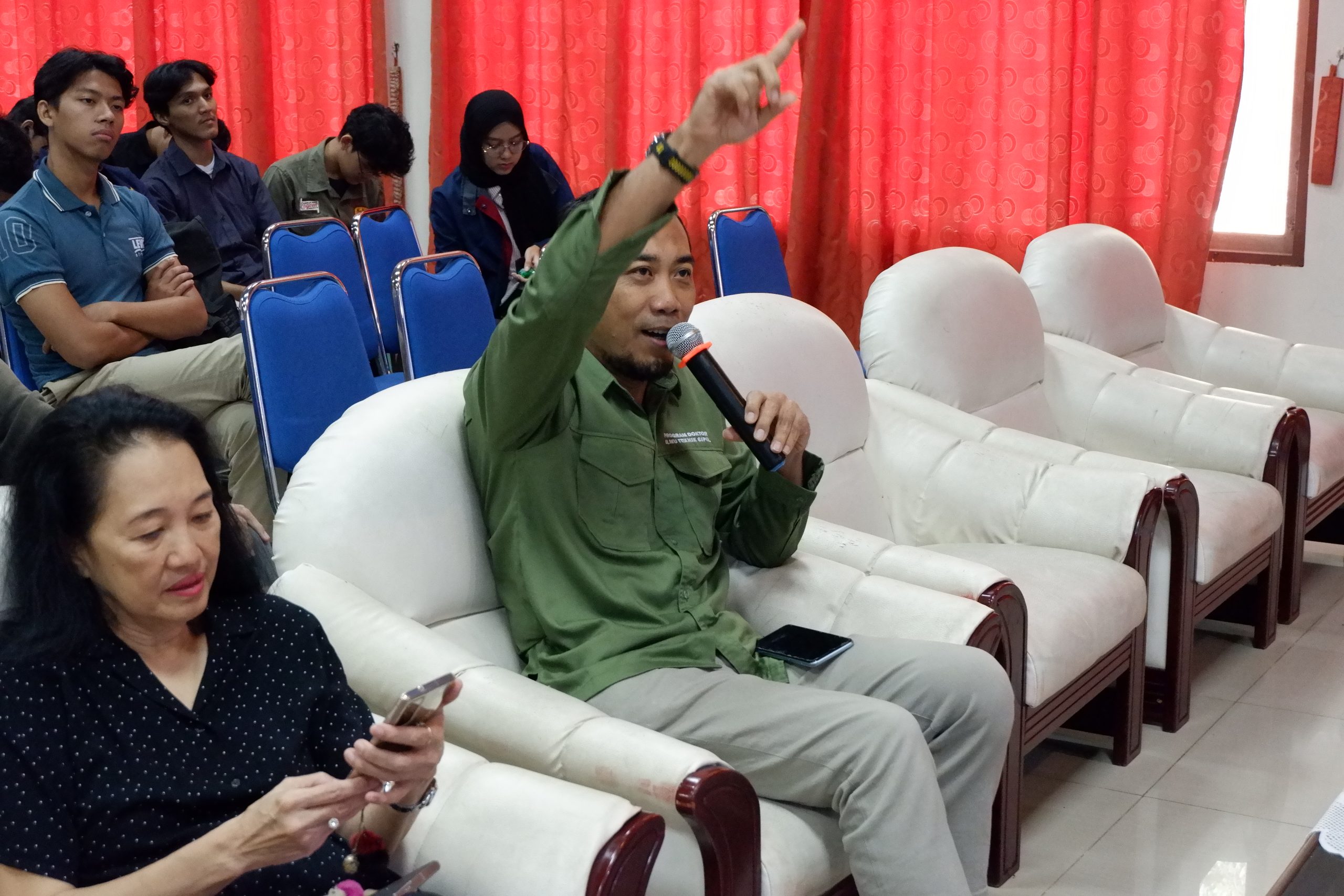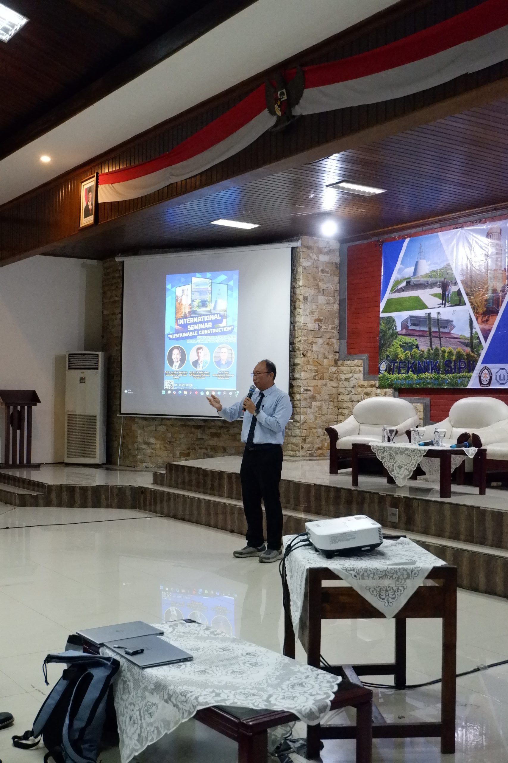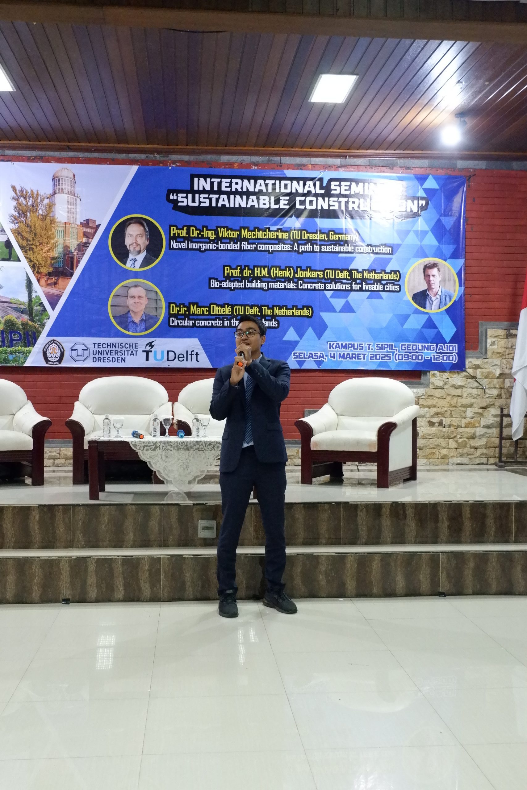 Seminar International di awali dengan menyanyikan lagu kebangsaan Indonesia Raya lalu dilanjut dengan sambutan dari Prof. Jati Utomo Dwi Hatmoko, S.T., M.M., M.Sc., Ph.D. selaku kepala Departemen Teknik Sipil, Universitas Diponegoro. Pada seminar ini, ketiga narasumber di moderatori oleh Dr.-Ing. Ir. Bobby Rio Indriyantho, S.T., M.T., IPM., ASEAN Eng. Sesi Paparan di mulai oleh Prof. Dr.-Ing. Viktor Mechtcherine dengan judul “Novel inorganic-bonded fiber composites: A path to sustainable construction”, lalu dilanjut oleh Prof. dr. H.M. (Henk) Jonkers dengan judul “Development of Innovative ‘Bio-adapted’ Building Materials” dan diakhiri oleh Dr.ir. M. Ottelé dengan judul “Towards a Fully Circular Concrete Industry”. Seminar International dilanjutkan dengan sesi tanya jawab yang sangat interaktif antara para mahasiswa dan narasumber hingga acara diakhiri dengan penyerahan cenderamata kepada ketiga narasumber oleh Prof. Jati Utomo Dwi Hatmoko dan foto bersama seluruh audience.