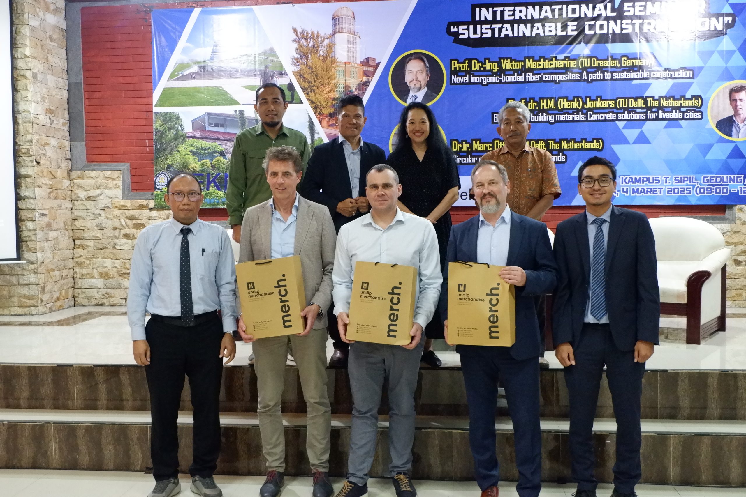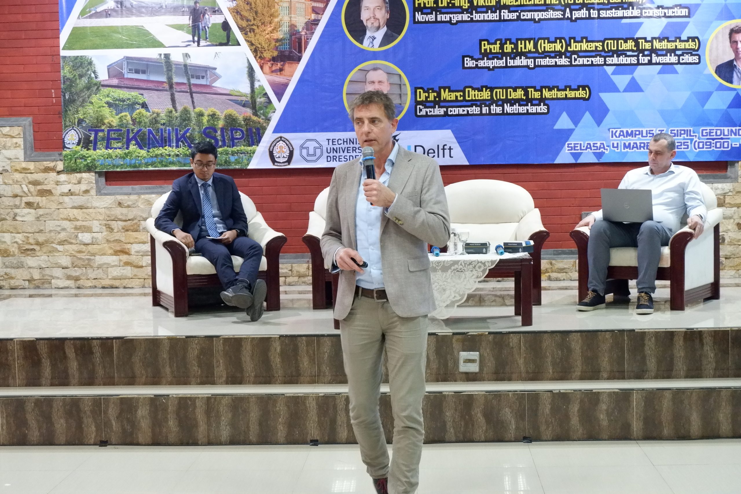 Selasa (04/03/2025) – Telah berlangsung Seminar International dengan tema “Sustainable Construction” di Kampus Teknik Sipil, Gedung A.101. Seminar ini merupakan suatu rangkaian dari program World Class University Universitas Diponegoro dengan kategori kegiatan Visiting Professor yang menghadirkan Prof. Dr.-Ing. Viktor Mechtcherine dari TU Dresden, Germany; Prof. dr. H.M. (Henk) Jonkers dan Dr.ir. M. Ottelé dari TU Delft, The Netherlands sebagai narasumber.