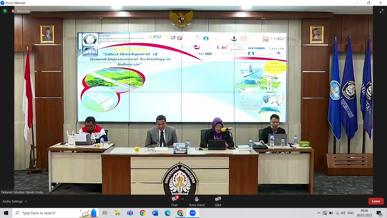 sipilsandbox.undip.ac.id – Klaster Research Center for Innovative Ground Improvement, Departemen Teknik Sipil UNDIP bekerja sama dengan berbagai pihak telah mengadakan webinar keilmuan pada hari Kamis, 26 Januari 2023. Tema webinar kali ini adalah “Latest Development of Ground Improvement Technology in Indonesia”. Total ada 11 pembicara dan 5 moderator yang terlibat dalam webinar ini, termasuk Prof. Dr. Ir. Sri Prabandiyani Retno Wardani, M.Sc. dan Dr. Kresno Wikan Sadono, S.T., M.Eng. dari Departemen Teknik Sipil UNDIP.